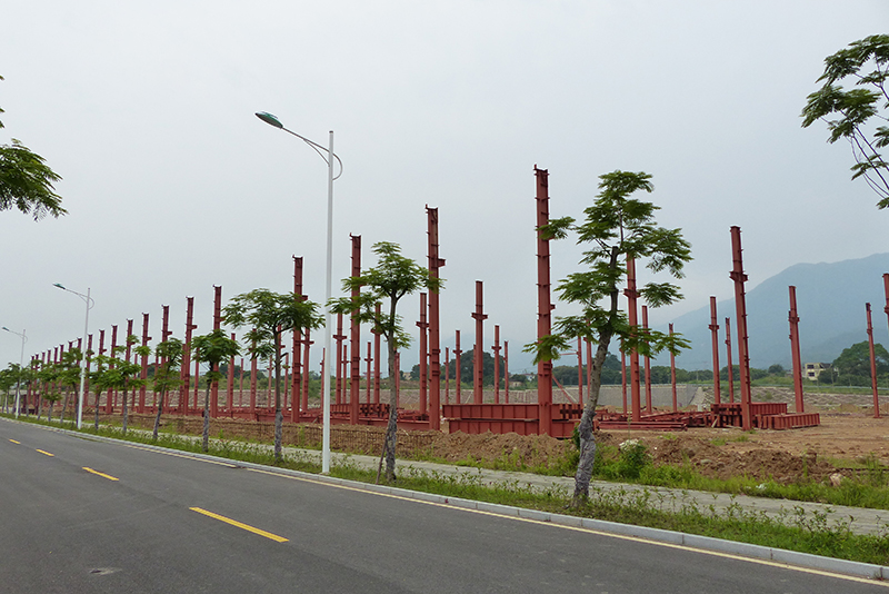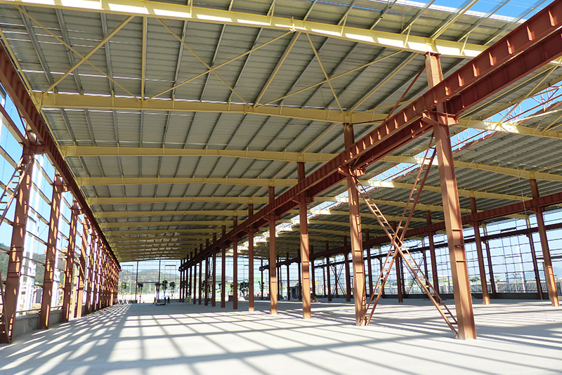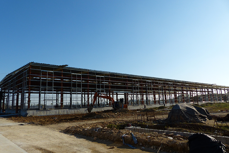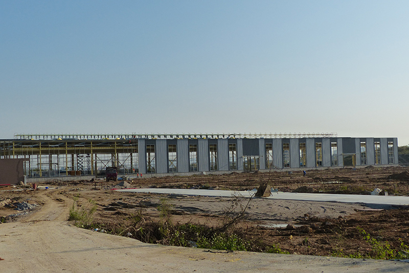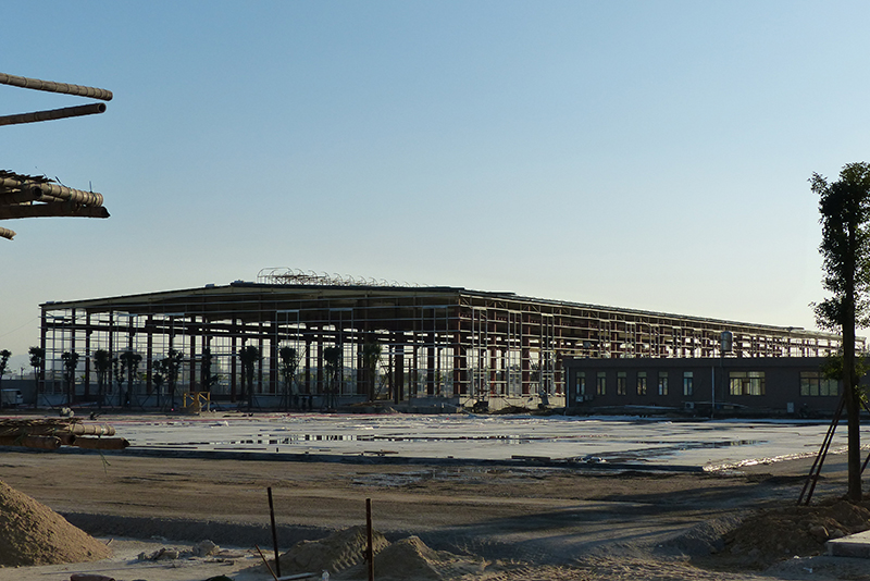 2016年12月9日,鋼結構框架整體搭建完畢,進入外墻及屋頂搭建,堆場也鋪設完成。
